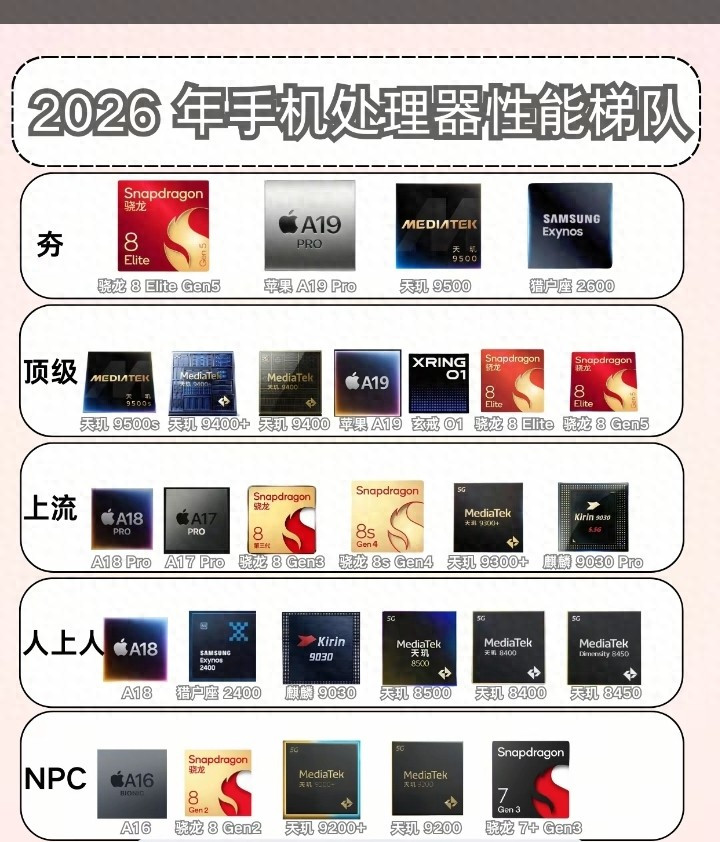 2026年2月手机处理器市场迎来新一轮的激烈竞争。各大芯片厂商纷纷推出性能强劲的新品。根据最新的性能梯队排行榜。手机处理器被划分为从夯到NPC的五个主要层级。这一排名直观地展示了当前市场上各款芯片的性能强弱。为消费者选购手机提供了重要参考。